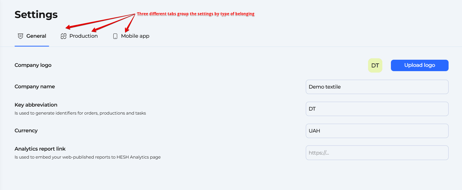 The Settings page in HESH provides a centralized platform for configuring system-wide options that affect both web and mobile apps. It enables customization of company-specific information, task management parameters, production deadlines, and user interface behavior to align with operational needs.